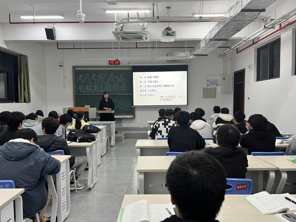 为全面学习贯彻党的十九届六中全会精神,着力做好我院学风建设,12月22日晚,微电子与材料工程学院在柳东校区T4-304教室举行了诚信考试教育和《高等数学》辅导活动。班主任李如雪、辅导员温传美以及2021级全体学生参加了本次活动。