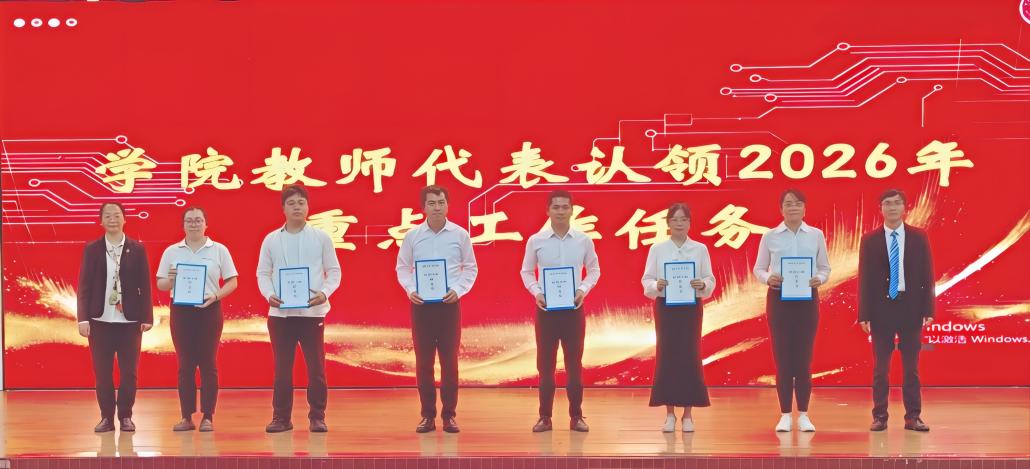 目标引领方向,承诺凝聚力量。会议第五项举行了庄重的2026年重点工作任务认领仪式。段淑玉、袁浩浩、孙子君、张雪萍、李福章、温传美、冯俊华等七位教师作为代表,上台从学院党委书记梁茜茜、院长陈华金手中郑重接过任务认领书。这既是一份责任状,更是一份军令状,彰显了学院教师主动担当、攻坚克难的决心。