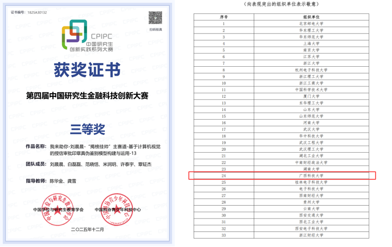 近日,第四届中国研究生金融科技创新大赛决赛结果揭晓,我院参赛团队斩获三等奖。该团队参赛作品是“基于计算机视觉的授信审评印章鉴别模型”。团队成员由刘晨晨、白磊磊、范晓恬、米润玥、许泰宇、覃钲杰等同学组成,陈华金、龚雪老师为指导老师。