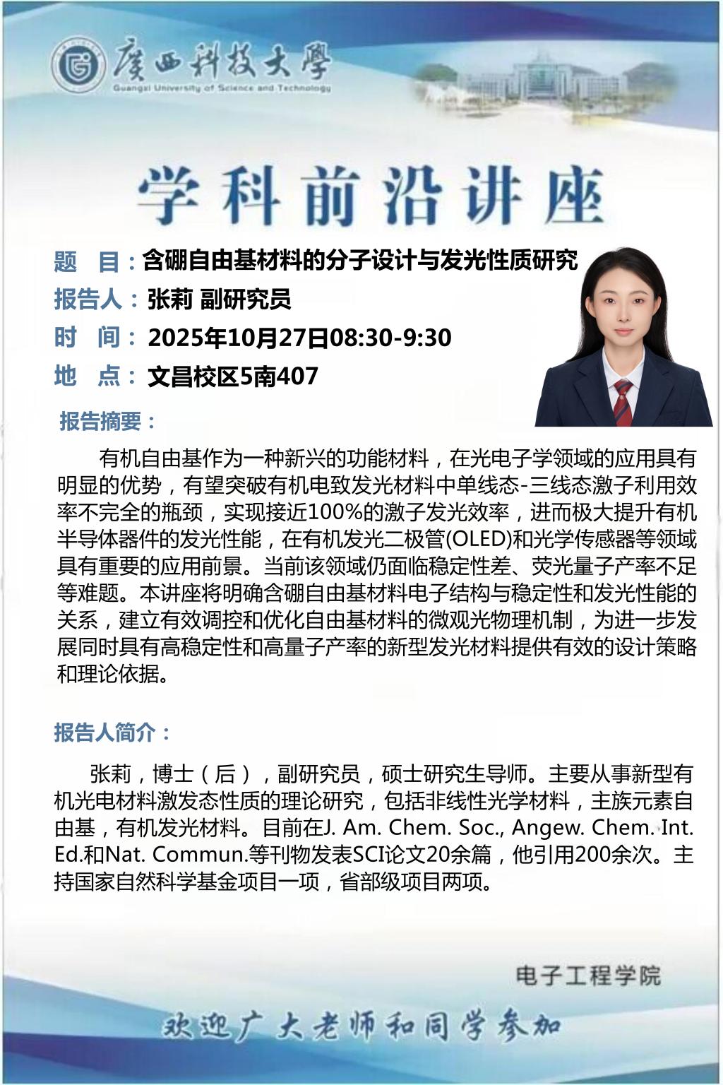 【前沿讲座预告】张莉:含硼自由基材料的分子设计与发光性质研究
