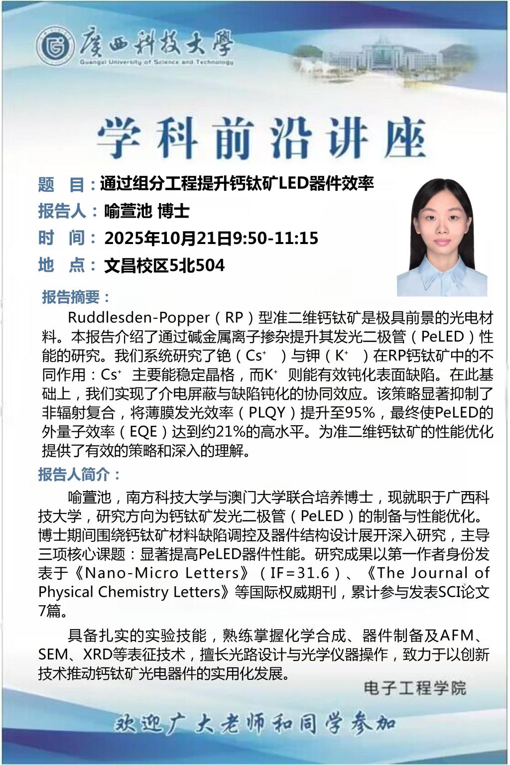 【前沿讲座预告】喻萱池:通过组分工程提升钙钛矿LED器件效率