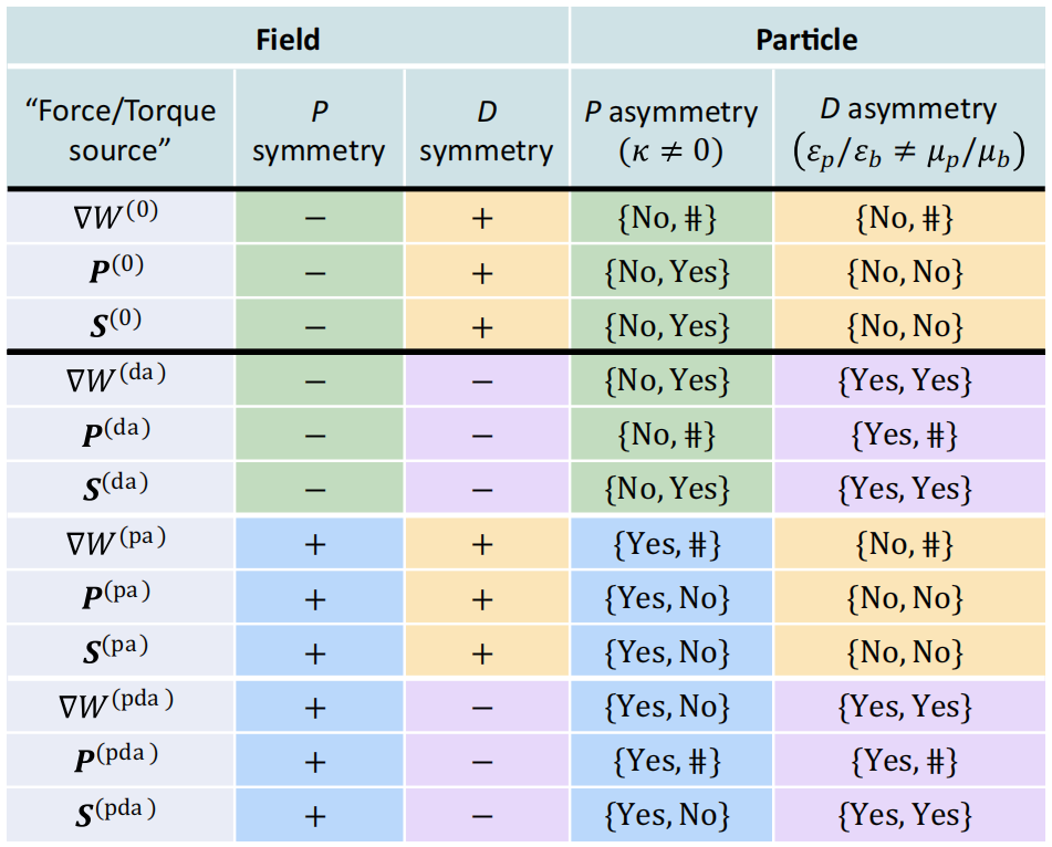 图示 任意单色光场中,任意尺寸及材料的双各向同性微粒所诱导的光力与光力矩,对操控光场结构及微粒的宇称-对偶(PD)对称性破缺的要求