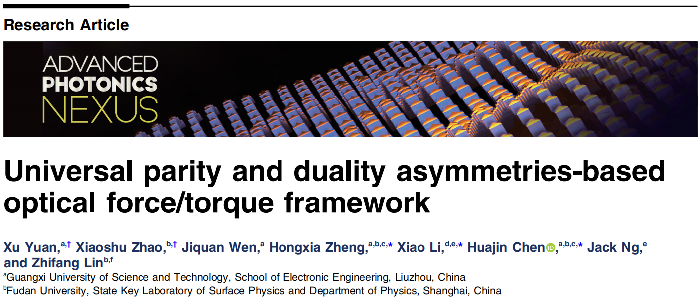 近日,我院“微纳光电子技术研究团队”联合复旦大学和南方科技大学在《Advanced Photonics Nexus》(编辑精选,IF=6,JCR一区)发表文章,题目为Universal parity and duality asymmetries-based optical force and torque framework,我院2023级硕士研究生袁旭(共一第一位,已录取为南开大学博士研究生)与复旦大学物理系博士生赵啸书为共同第一作者,通讯作者为广西科技大学郑红霞副教授、陈华金教授和南方科技大学李肖博士。广西科技大学为第一单位。