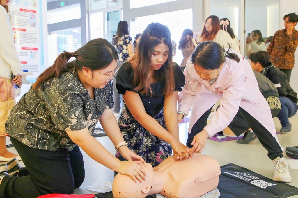 用“心”守护,“救”在身边。由美国心脏协会导师黄富献副校长为研学团学生们开展急救知识演练和讲解,从心脏骤停的症状识别到如何正确翻转病人、环境判断、互救求助等,通过人体模型现场演示了心肺复苏的完整操作步骤和自动体外除颤器(AED)的使用方法,在亲身实践环节,研学团学子们积极参与练习,相互纠错相互指导,反复练习。他们纷纷表示,通过实操练习,他们能够更加自信地面对可能发生的紧急情况。