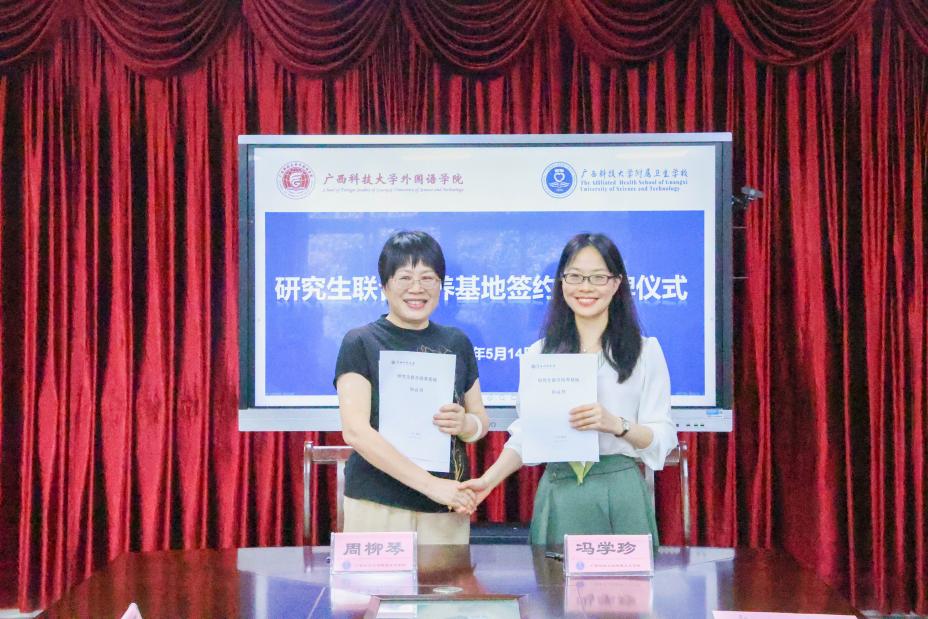 在热烈的掌声中,附属卫校校长冯学珍与外国语学院院长周柳琴代表双方共同签署了研究生联合培养基地合作协议。