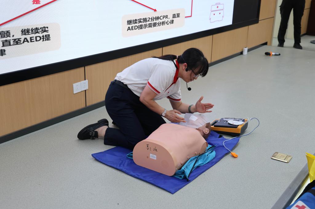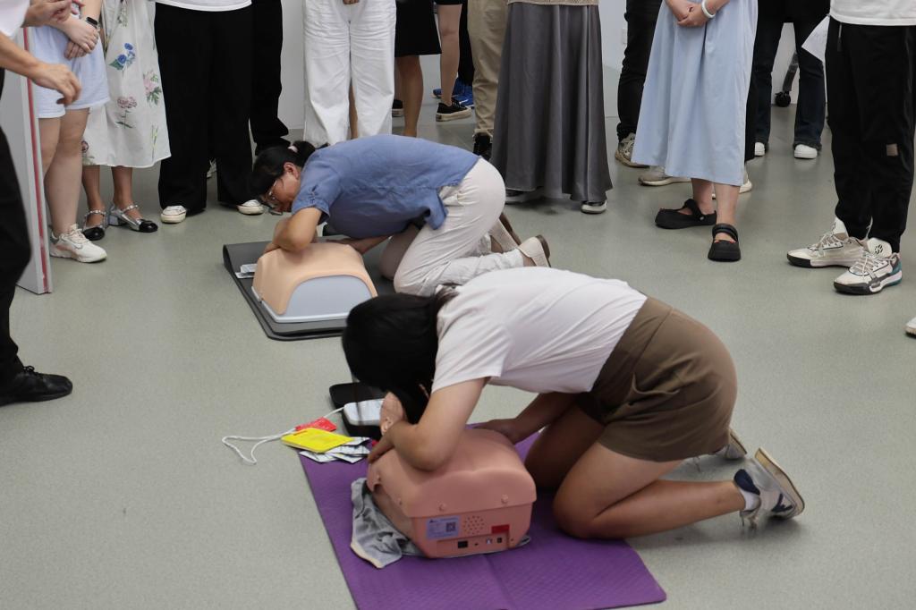 在实操环节,培训师利用专业的人体模型和AED训练机一步步演示了判断意识、呼救、胸外按压、开放气道、人工呼吸以及正确使用AED的全过程。师生们学习热情高涨,在专家的“一对一”指导下,纷纷上前进行实操练习,从生疏到熟练,力求每一个动作都标准、到位。此外,针对常见的儿童及成人气道异物梗阻情况,培训师还生动演示了“海姆立克急救法”的操作技巧。