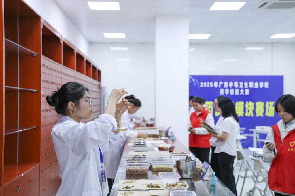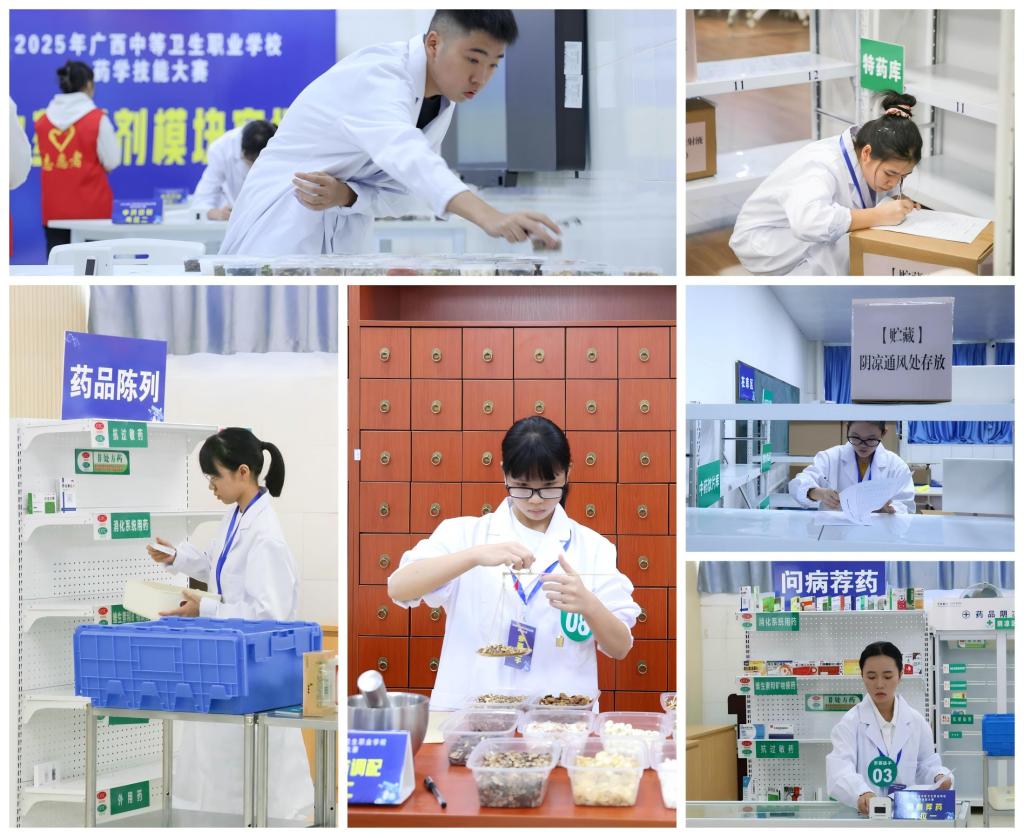 大赛设置理论竞赛和技能操作两大模块,技能操作涵盖药物储养、药品购销和中药调剂等3个赛项,全面考察选手的专业知识应用能力、操作技能规范及职业综合素质。比赛过程组织严谨、节奏紧凑,选手们沉着应战、操作娴熟,充分展现了广西药学、中药专业中职学子扎实的专业功底和良好的精神风貌。