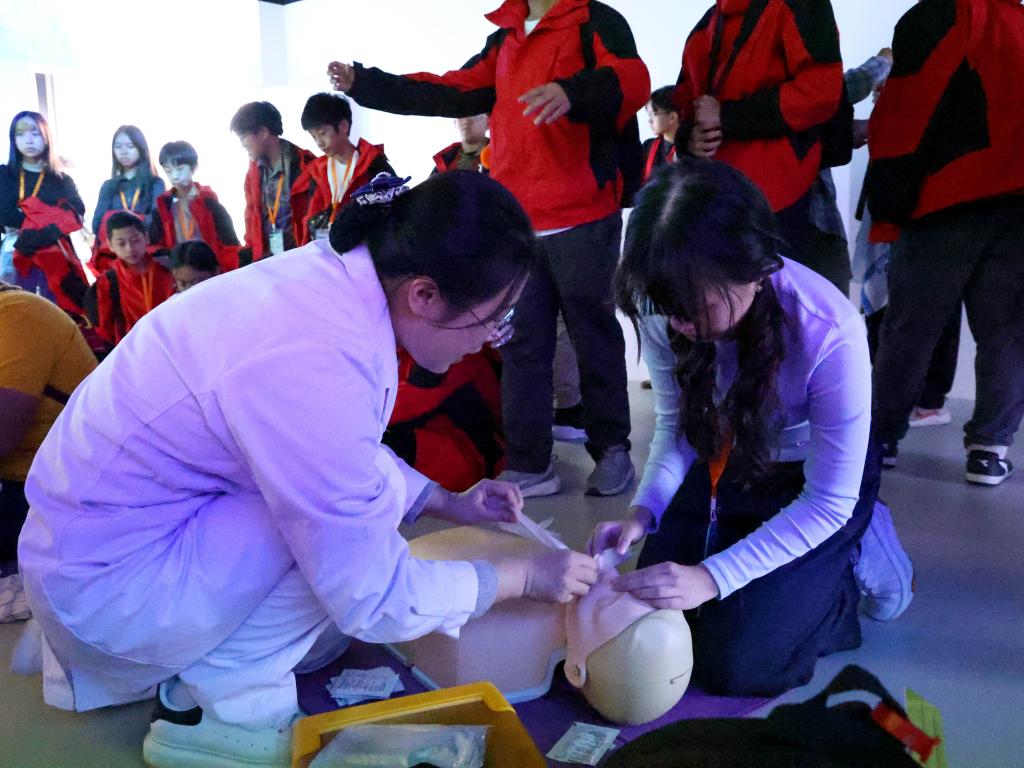 在急救教育示范区,印尼师生现场观摩并学习了急救技能,深入了解了“学急救技能,护一世平安”的重要性。活动的高潮部分是在中医实训室和药剂实训室,印尼师生观看了中医针灸和推拿的演示,认识了中草药标本并了解其功效,最后师生们还亲手制作了具有中医药特色的香囊,在互动中深切感受到中医药文化的独特魅力。