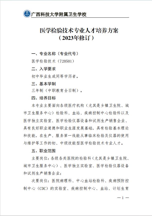 广西科技大学附属卫生学校2023年检验专业人才培养方案