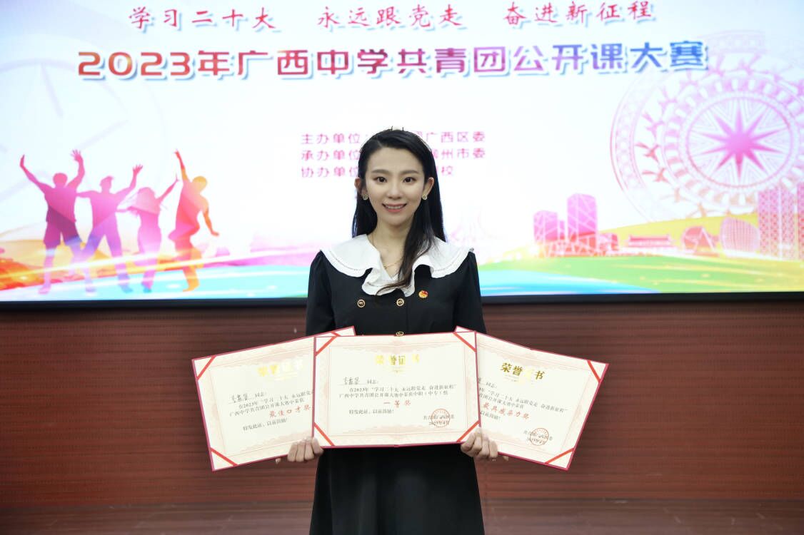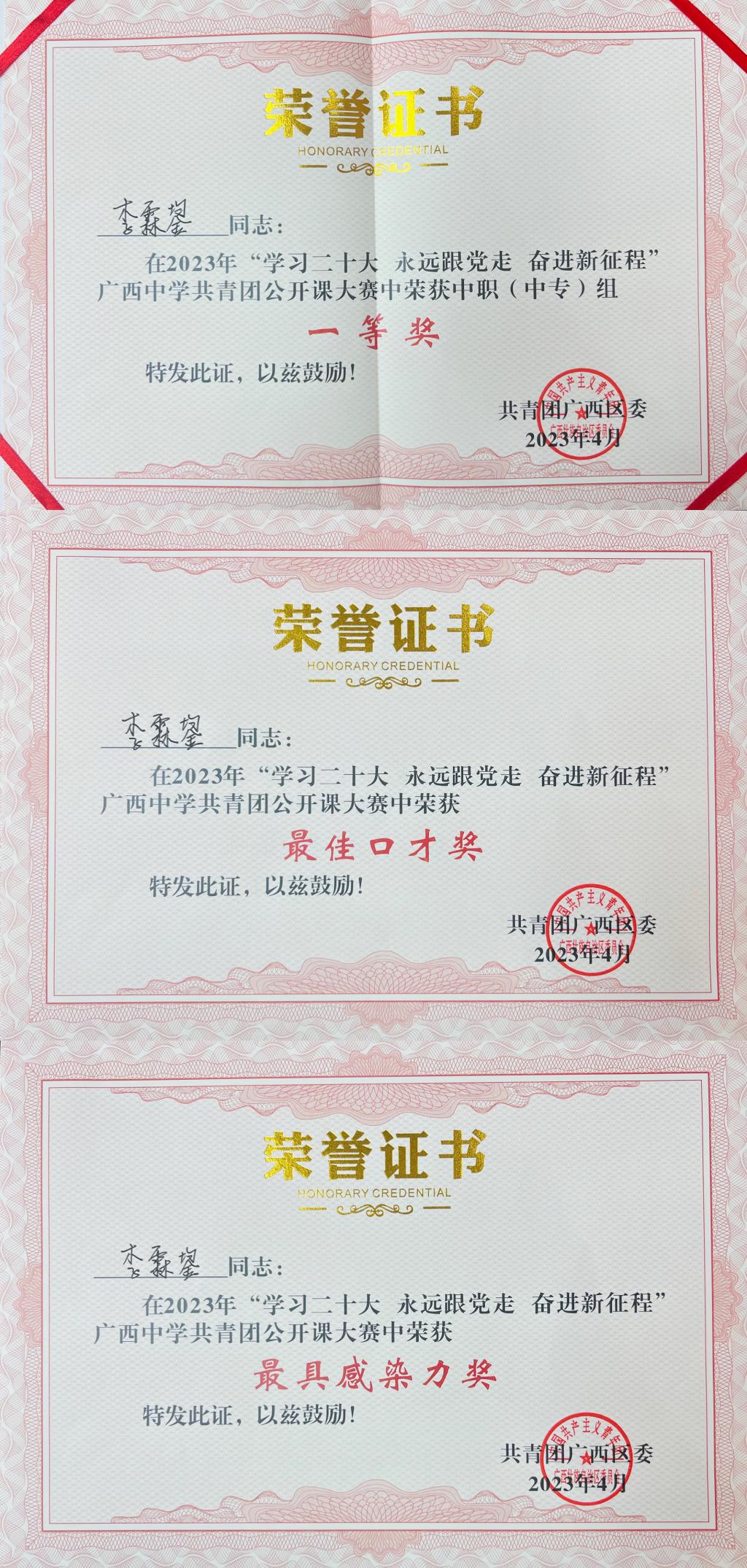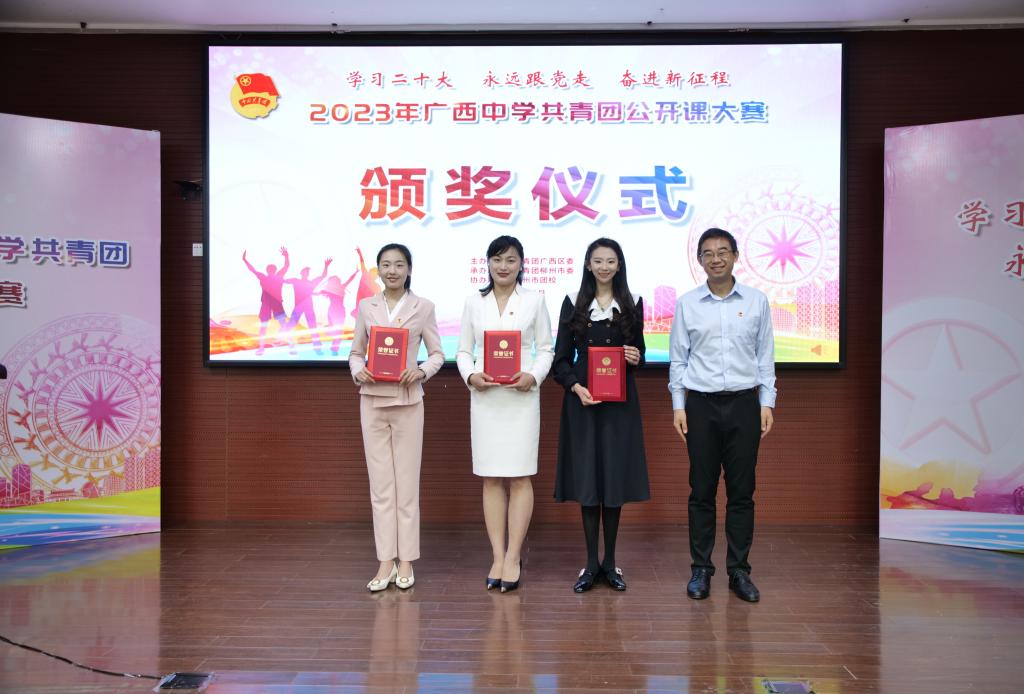 4月17日—19日,由共青团广西区委主办、团柳州市委承办、柳州市团校协办的2023年广西中学共青团公开课大赛在柳州市团校举行。全区各地市、区直机关选送的中职(中专)组、高中组、初中组三个组别的14支代表队、45名选手齐聚柳州展开精彩对决。柳州市代表队选派3名选手组团参赛,我校团委书记李霖鋆入选柳州市代表队成员。柳州市代表队在参赛的14支队伍中表现出色,经过3名队员的拼搏努力,荣获集体二等奖。