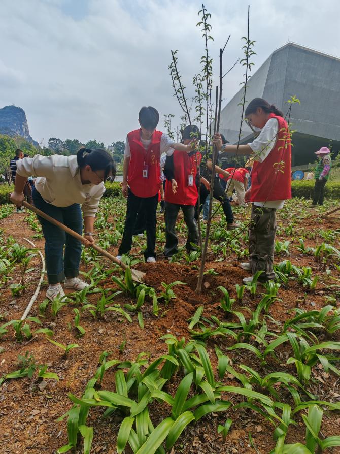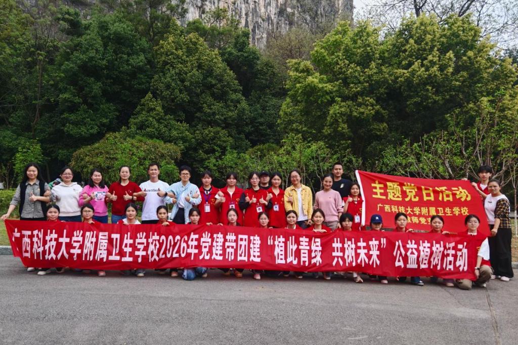 为深入学习贯彻习近平生态文明思想,充分发挥党建引领作用,3月24日下午,附属卫生学校组织教师党员和团员学生代表前往柳州市白莲洞博物馆,开展“植此青绿 共树未来”公益植树活动。