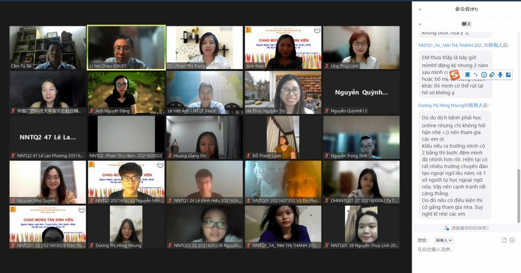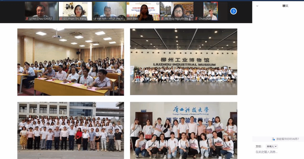 10月6日晚上9点(河内时间晚上8点),由越南河内工业大学国际交流处与外语系联合举办的“广西科技大学与河内工业大学汉语‘2+2’联合培养项目2021级新生推介会”在线举行。参会人员有该校国际交流处、外语系主要领导、中文专业全体教师以及133名2021级越南新生,我校国际合作与交流处(国际教育学院)赵足娥副处长(副院长)、国际交流科李燕洲科长应邀参加。