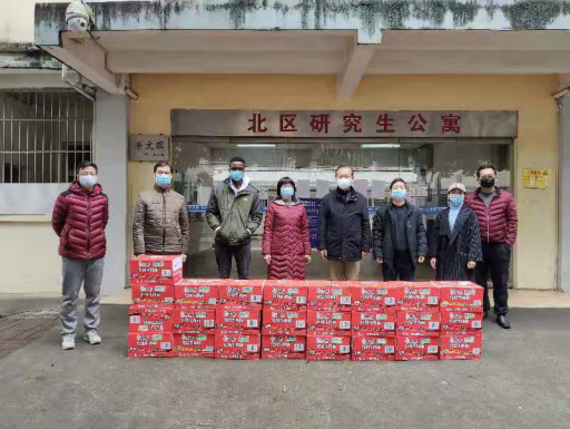 庞主任一行还给每一位在校留学生送来了慰问品。留学生代表来自尼日利亚的韦开力向前来看望慰问的领导表达了留学生们的感谢并送上了他们的祝福。