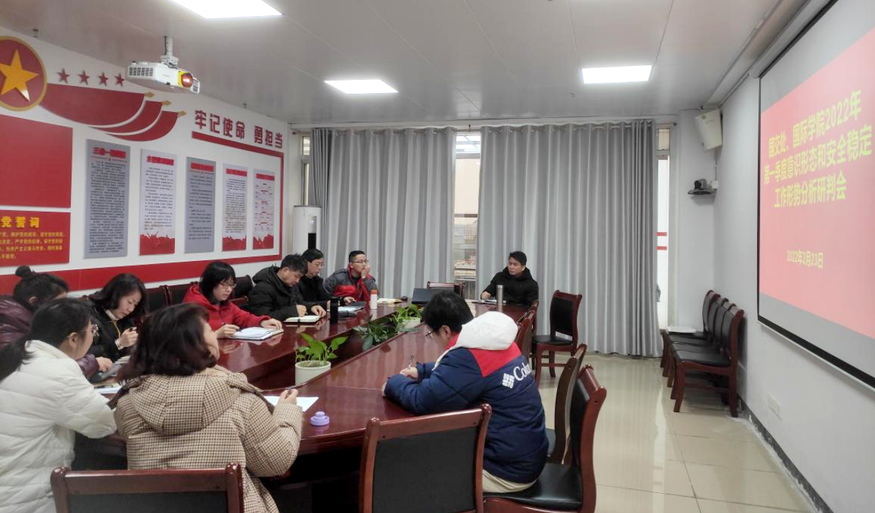 2022年2月23日下午,国交处、国际学院在科教北1406-2室召开2022年第一季度意识形态和安全稳定工作形势分析研判会。会议由学院党总支邓杏华书记主持。学院领导班子成员、专职组织员和科级干部参加会议。