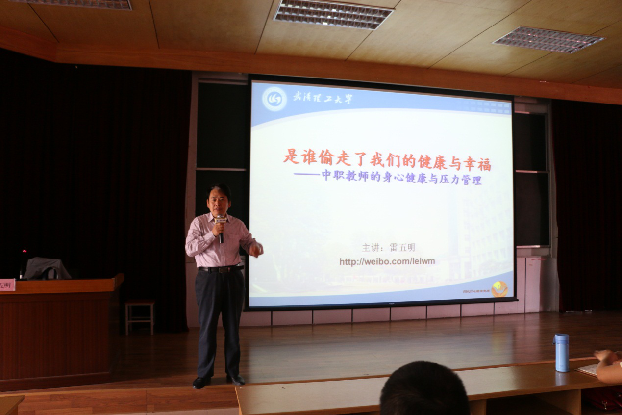 10月22日至23日,应我校国培基地邀请,武汉理工大学心理健康与职业发展研究所所长、武汉理工大学学生心理健康与发展指导中心高级心理咨询师、学生就业创业指导中心职业规划师,中国心理学会科普委委员雷五明教授在我校东环校区4阶4教室作题为“中职教师的身心健康与压力管理”和“如何基于新生代青年学生的心理与行为特点开展互动式教学”的专题培训讲座。本次培训为期两天,前来我基地参加国家级培训回补项目的全体参训学员、职业技术教育学院部分教师与学生参加了此次培训。