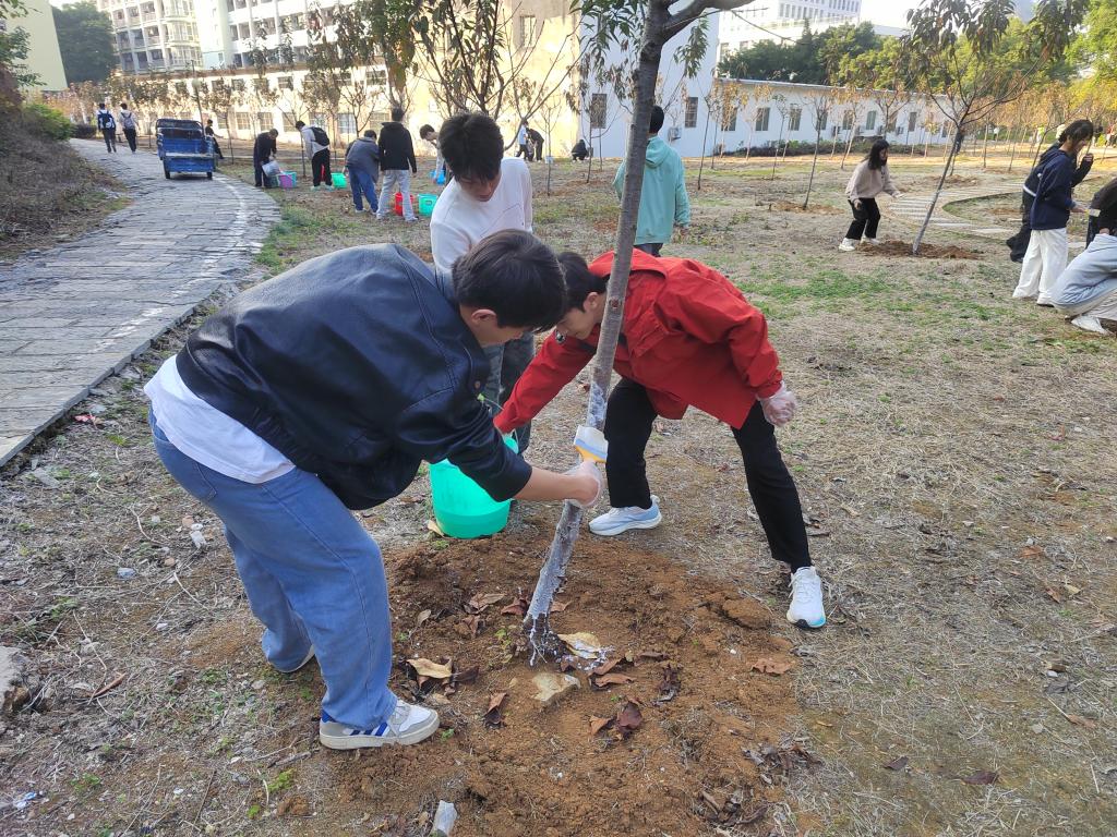 12月19日下午,后勤管理处联合理学院组织30余名学生志愿者,在文昌校区校友林开展“校园生态环境提升”主题志愿服务活动,重点完成樱花树冬季刷白养护工作。
