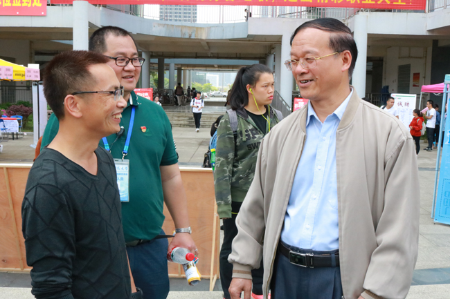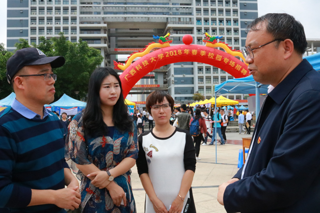 校党委书记覃伟年、副校长王康平亲临招聘会现场指导工作,与来校招聘的湖南省宁乡市人力资源和社会保障局副局长、深圳市跨境电商研究会会长、益阳商会会长、河池商会会长、广西科技大学江门校友会会长等参会代表进行亲切交流。王康平表示,希望用人单位和人才机构可以合作共建学生实习基地,为我校学生提供社会实践平台,让学生提前接触社会,增加相关工作经验。此外,希望企业在我校设立企业奖学金,今后在为企业提供新鲜血液的同时,也可以提高学生学习的积极性。覃伟年与王康平对来校招录毕业生、支持我校就业工作的政府单位、社会团体以及广大企业表示感谢。此外,两位校领导还给参加面试的毕业生提出指导意见以及加油鼓励。