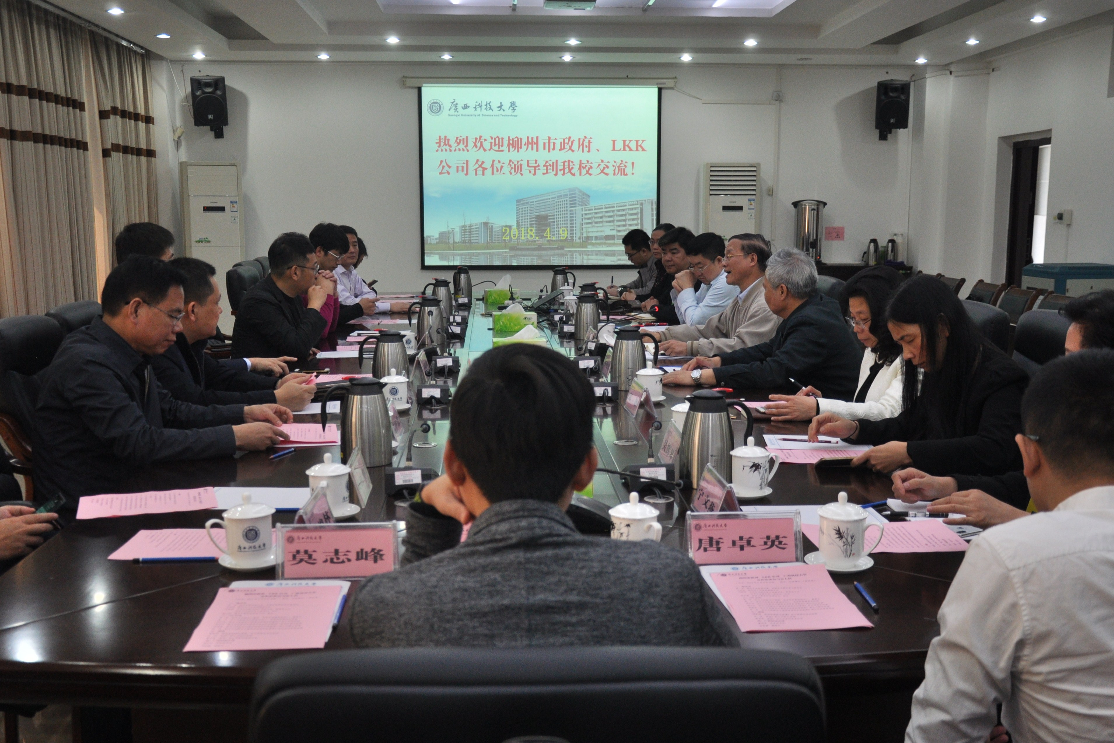 4月9日上午,柳州市政协副主席、柳州北部生态新区党工委书记黄涛,洛可可创新设计集团(LKK)、洛客科技集团创始人、董事长贾伟等管理团队一行到我校开展政校企三方合作办学洽谈工作。洽谈会在东环校区行政办公楼6-1会议室举行。校党委书记覃伟年、副校长李创第以及党政办、教务处、科研处、规划处、机械学院、土建学院、艺术学院等单位主要领导参加会议。