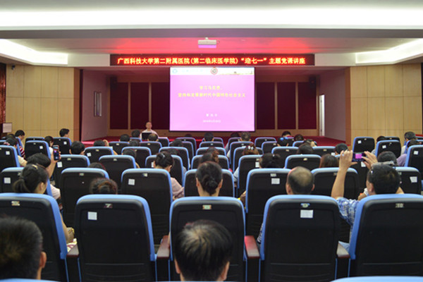 为庆祝中国共产党建党97周年,深入学习贯彻习近平总书记在纪念马克思诞辰200周年大会上的重要讲话精神,6月20日,广西科技大学第二附属医院举办“迎七一”主题党课讲座,邀请学校党委书记覃伟年到院授课主讲。医院领导班子成员、全院中层干部及全体在职党员、入党积极分子参加了学习。医院党委书记覃莲主持学习会。