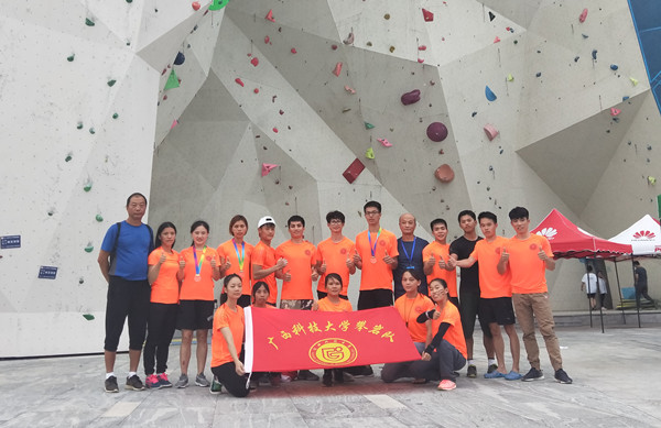 我校攀岩队参加了普通院校组、体育院系组、高水平运动员组的比赛,其中表现最佳的是高水平运动员组的任桂珊和潘小珊同学,她们包揽了高水平运动员组女子速度赛冠亚军,该组奖牌是全国大学生攀岩锦标赛中含金量最高的奖牌,两人也凭此成绩夺得团体总分第一名。我校在没有攀岩高水平运动员特招的情况下,通过科学有效的训练将两名普通学生培养成专业组的冠亚军,是一个较大的突破。作为2018届毕业生,此次也是任桂珊和潘小珊最后一次代表学校出战全国大学生攀岩锦标赛。目前两人已经成为广西攀岩队的签约运动员,未来将在国际国内的攀岩赛场继续为母校争光。