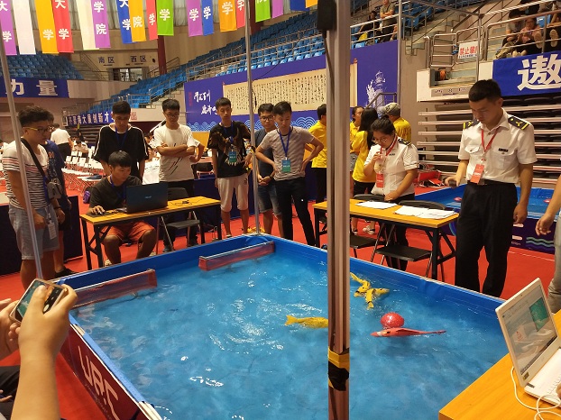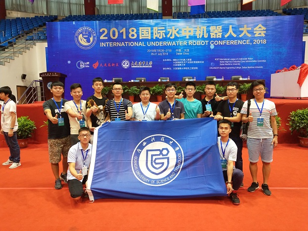 7月26日至27日,由国际水中机器人联盟(ILUR)、大连高新技术产业园区管委会和大连海事大学主办,大连海事大学轮机工程学院承办的“2018国际水中机器人大赛”在大连海事大学体育馆举行。经过激烈角逐,由刘胜永和潘勇才老师带领的广西科技大学代表队(共有13名参赛队员,组成3支研究生队,1支本科队)在与来自美国普渡大学、布朗大学、加州大学圣迭戈分校、北京大学、浙江大学、哈尔滨工业大学和福州大学等国内外60多所知名高校代表队的同场竞技,获得目标抓取组——定点遍历冠军,同时取得一等奖2项、二等奖1项、三等奖5项,我校还荣获优秀组织奖。本次大赛共有200多只队伍共500多名参赛选手参加,分别在水下机器人竞速、目标识别抓取、全局视觉及自主视觉等组别上一决高下。作为2018国际水中机器人大会重头戏之一,本次大赛以智能仿生机器鱼为主体,在水中进行各类竞赛,包括竞速、花样游泳、追逐和激烈对抗的水球比赛。