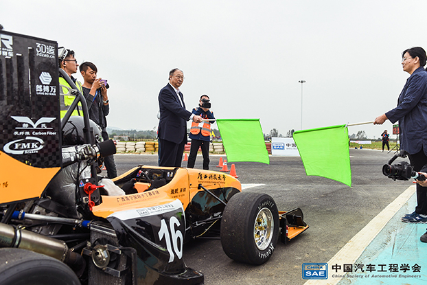 中国工程院院士、中国汽车工程学会理事长李骏,襄阳市人民政府副市长丁亚琳为我校赛车发车