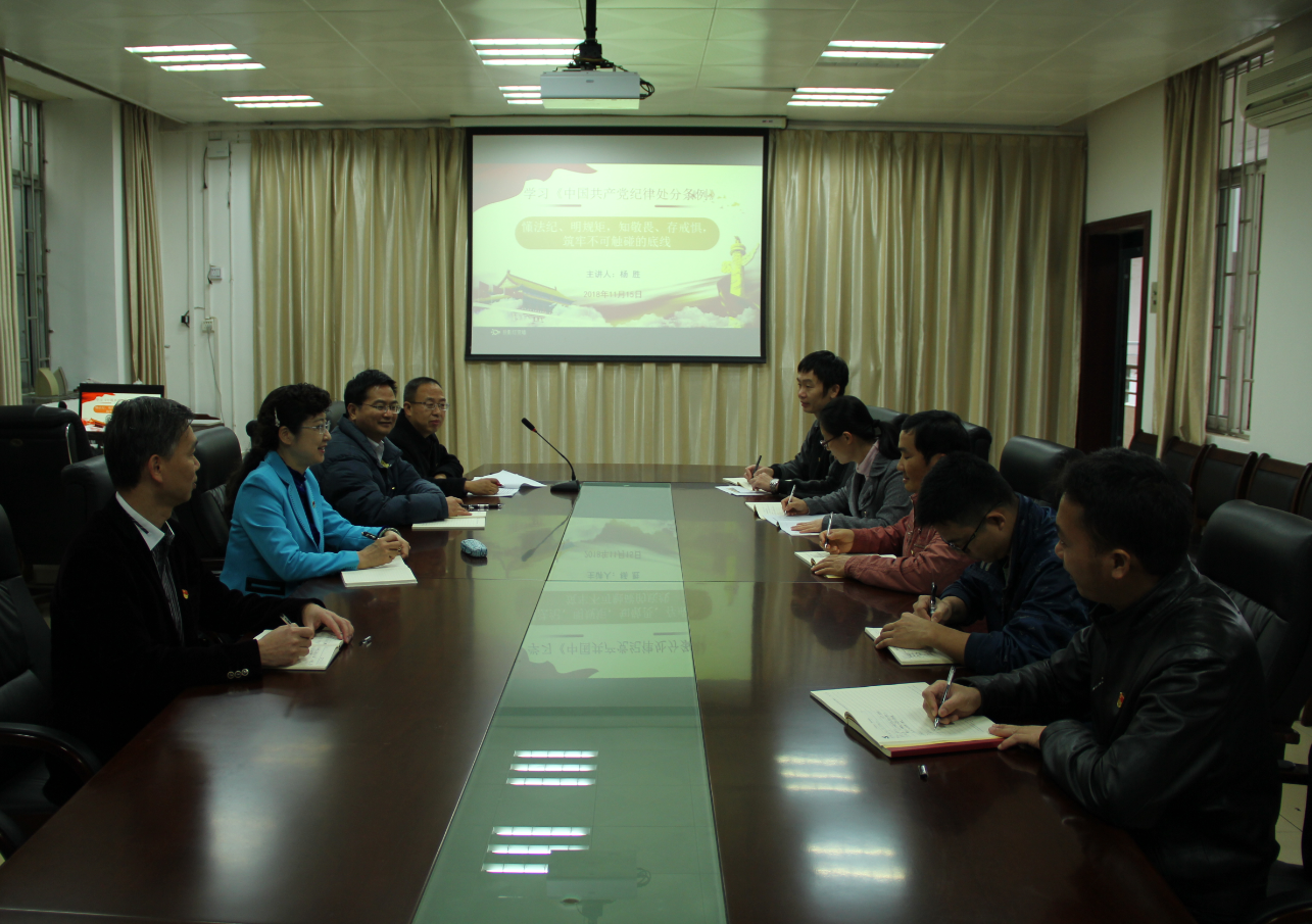 11月15日下午,继续教育学院党总支理论学习中心组组织学习新修订的《中国共产党纪律处分条例》。学习由学院党总支书记黄殿芳主持,学院党总支纪检委员杨胜主讲,学院处级领导及中心组成员均参加学习。