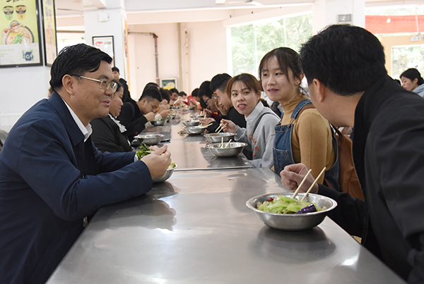 12月16日上午,校党委书记满昌学率领党校办、学工部(处)、校团委、后勤处相关部门负责人深入学生宿舍调研,并在学生食堂与同学们一同共进午餐。
