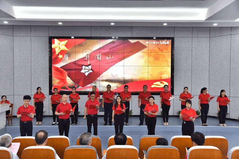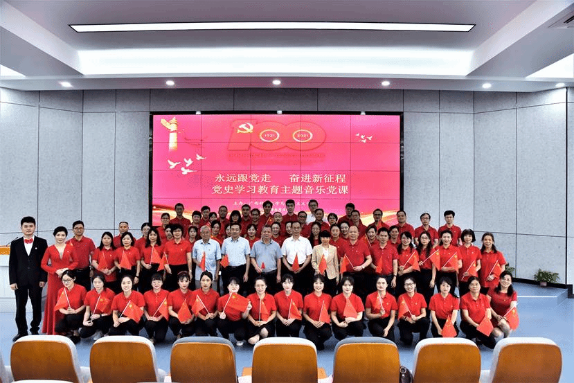 当《红船从南湖启航》配乐诗朗诵响起,师生挥舞着党旗和国旗,现场气氛激情澎湃。随后,师生们深情演绎《三大纪律八项注意》《我爱这土地》《我和我的祖国》《盛世中国》等经典红色歌曲和诗歌。本次音乐党课以中国共产党带领中国人民站起来、富起来、强起来的奋斗历程为主线,依据作品产生的时代背景分为“红船领航:新民主主义革命”“日出东方:社会主义革命建设”“筑梦路上:改革开放和社会主义现代化建设中国特色社会主义新时代”三个篇章,以合唱、对唱、独唱、诗歌朗诵、情景剧等多样的形式、丰富的内容和精彩的表演呈现了一堂具有深刻教育意义的党课。主题音乐党课高潮迭起,音乐和视频故事贯穿其中,师生们受到一次艺术的熏陶、思想上的洗礼和精神上的升华。主题党课在《没有共产党就没有新中国》的合唱中结束。
