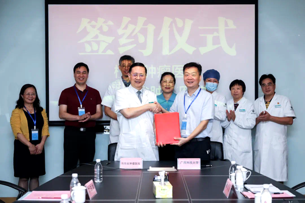 在交流座谈会上,秦小云听取了医院教研室主任对学生实习过程的反馈与评价,并代表我校与海南省肿瘤医院签订《广西科技大学实习基地协议书》。孙文忠代表我校第二附属医院(柳州肿瘤医院)与海南省肿瘤医院同步签署《肿瘤专科医疗联合体跨区域合作协议》。双方表示将积极探索建立癌症综合防治工作模式和长效机制,加强跨区域癌症防治中心之间的配合协作,承担跨区域癌症防治技术指导职能,进一步健全跨区域癌症防治协作网络,提高跨区域癌症防治服务能力。