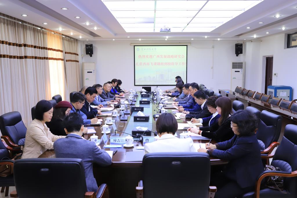 3月8日上午,广西发展战略研究会“孔雀西南飞”课题组组长江东洲率调研组一行10人到我校开展调研。学校党委书记赵君,学校党委常委、副校长徐武彬,学校党委常委、纪委书记黎东,学校党委常委、副校长黄永春参加相关活动。双方在东环校区办公楼6—1会议室召开座谈交流会,会议由徐武彬主持。