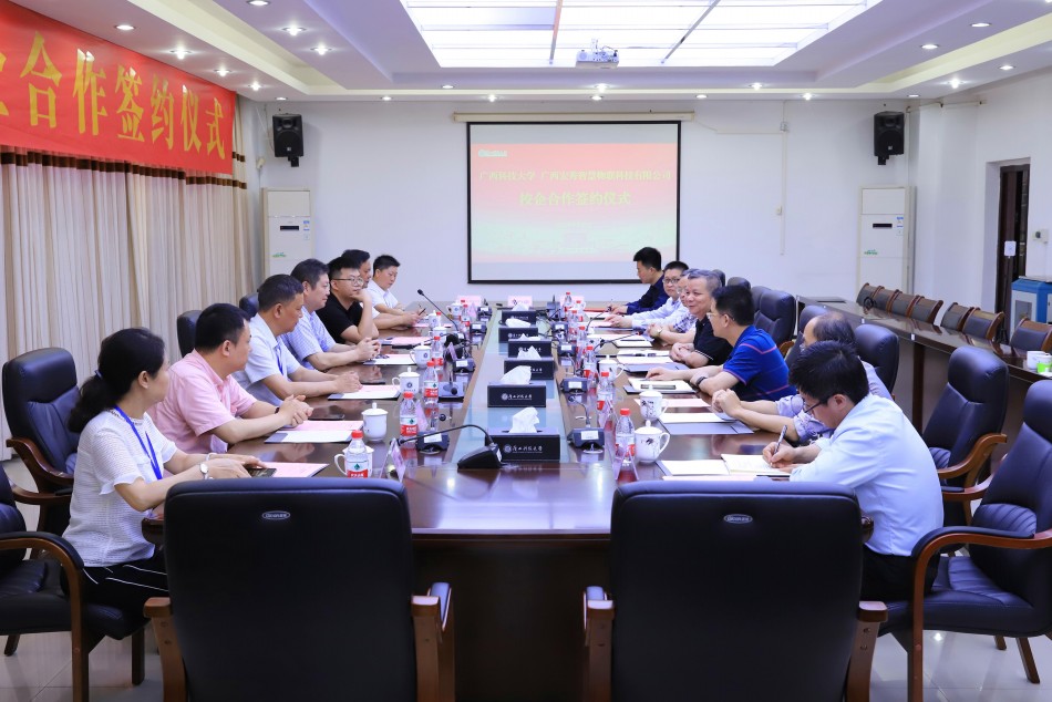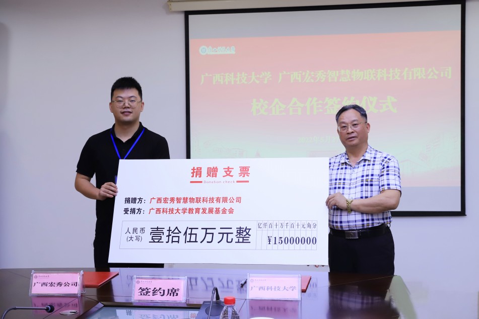 签约仪式上,张发钦代表学校与宏秀物联公司董事长朱一铭签订了校企合作协议书,并颁授了“广西科技大学产学研合作单位”牌匾。宏秀物联公司向我校赠授了设立奖助学金的捐款支票。