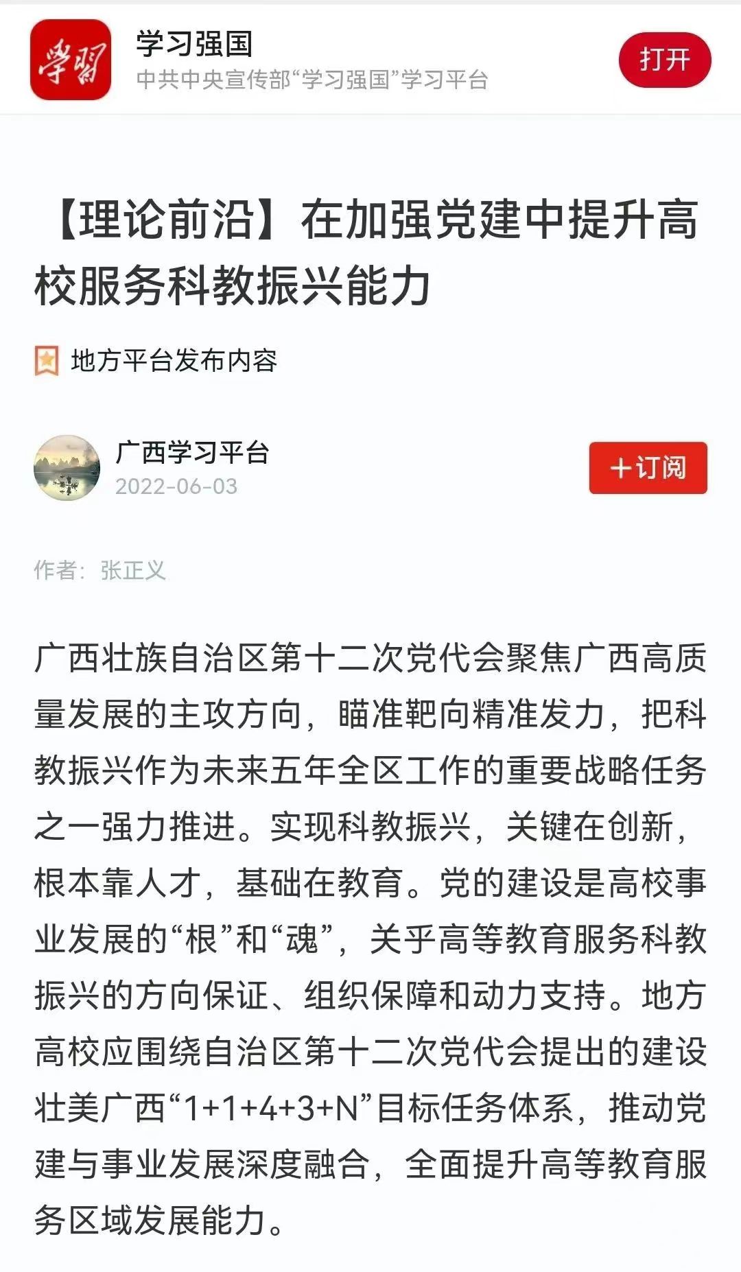 5月31日,《广西日报》理论版刊发我校党委副书记张正义的署名文章《在加强党建中提升高校服务科教振兴能力》,该文也被学习强国平台收录。