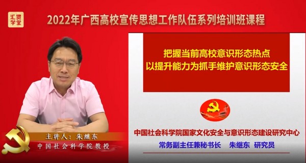 培训期间,学员们先后聆听了教育部思政司原司长、中国教育发展战略学会思想道德建设专业委员会理事长、北京师范大学思想政治工作研究院院长、教授、博士生导师冯刚作的题为《习近平总书记关于青年工作的重要论述——增强时代新人培育的志气、骨气和底气》专题讲座,我校党委书记、教授、博士生导师赵君作的题为《提升政治能力 锻造忠诚干净担当宣传思想干部队伍》专题讲座,中国人民大学国际关系学院副院长、中国人民大学中国对外战略研究中心主任、教授、博士生导师金灿荣作的题为《全球新态势与中美关系:中国的机遇与挑战》线上讲座,广西医科大学心理学教授唐峥华作的题为《心理压力调试与阳光心态》专题讲座,中共广西区委党校、广西行政学院党史党建教研部主任、教授卢尚纯作的题为《学习十九届六中全会精神,正确认识党的百年奋斗重大成就和历史经验》专题讲座,自治区党委网信办主任金化伦作的题为《新形势下网络舆情特点和危机处理》专题讲座,中国社会科学院研究员朱继东作的题为《把牢当前高校意识形态热点,不断提升政治判断力》线上讲座。