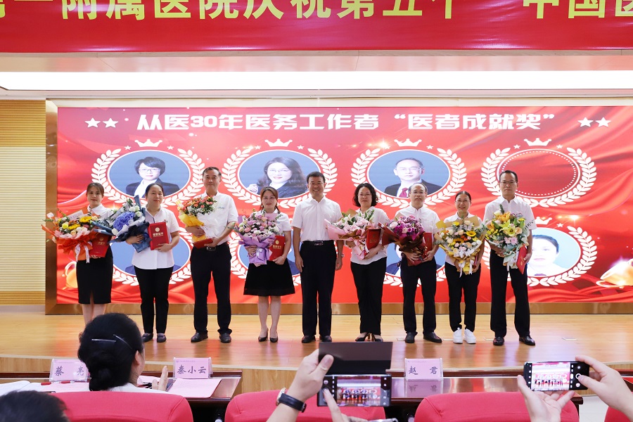 随后,赵君一行出席了第一附属医院(第一临床医学院)庆祝第五个“中国医师节”表彰大会。大会对从医30年的8名医务工作者、10名“最美医生”、优秀抗疫医生以及在教学、科研等方面表现优秀的先进个人与先进集体进行颁奖。