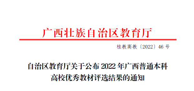 在本次广西普通本科高校优秀教材评选申报过程中,学校全面梳理了近年来教材建设成果,精心筹划,深入挖掘教材亮点、特色与创新点,共推荐4部本科教材参与此次评选活动,最终4部教材获得广西普通本科高校优秀教材二等奖。