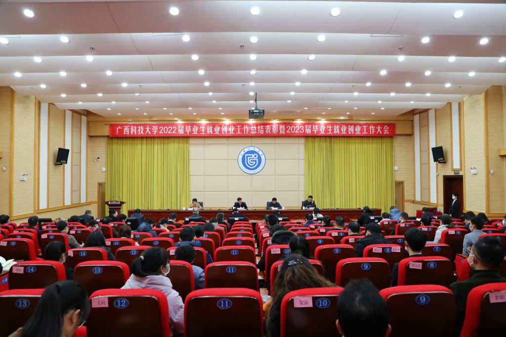 为深入学习宣传贯彻党的二十大精神,认真落实全国、全区2023届普通高校毕业生就业创业工作网络视频会议有关部署要求,总结2022年我校毕业生就业创业工作,统筹推进2023届毕业生就业创业有关工作,12月9日,我校在文昌校区多功能报告厅召开2022届毕业生就业创业工作总结表彰暨2023届毕业生就业创业工作大会。学校党委书记赵君,党委副书记、校长刘宝臣,党委副书记覃萍,党委常委、副校长徐武彬参加会议。会议由徐武彬主持。