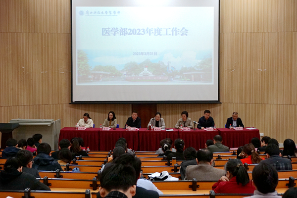 3月31日,医学部在柳石校区第一报告厅召开2023年度工作会。学校党委常委、副校长、医学部党委书记、主任秦小云出席会议,医学部领导班子、第一临床医学院(第一附属医院)、第二临床医学院(第二附属医院)主要领导,以及医学部各系部负责人、教研室(实验室)主任及全体辅导员、班主任参加会议。会议由医学部党委副书记、常务副主任孙文忠主持。