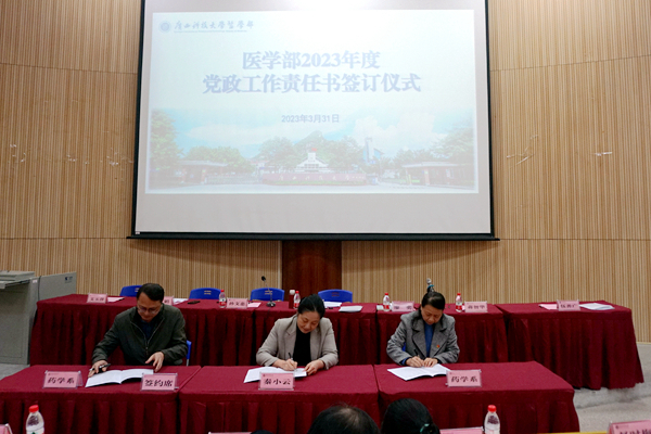 会议第二阶段为医学部2023年度党政工作责任书签订仪式。学部党委常务副书记廖奕对2023年医学部党政工作要点进行了介绍。秦小云与各单位、各部门负责人签订了2023年工作目标责任书。一份份目标责任书犹如沉甸甸的“军令状”,为学部发展吹响了奔赴使命的冲锋号。