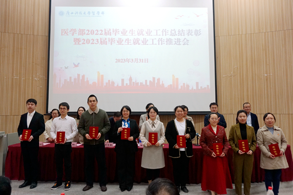 会议分三个阶段。第一阶段为2022届毕业生就业工作总结表彰暨2023届毕业生就业工作推进会。会上,医学部党委副书记蓝娟作毕业生就业工作总结;出席领导为2022年毕业生就业工作先进集体和先进个人颁奖,就业工作先进集体和先进个人代表作了经验交流发言。
