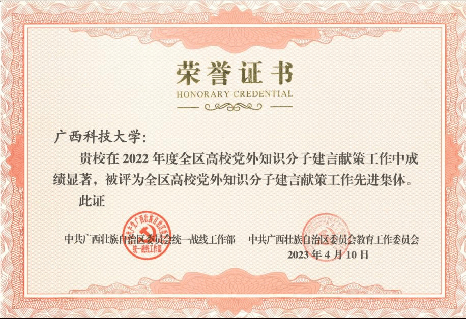 近日,全区党外知识分子工作推进会暨高校党外知识分子建言献策经验交流会在南宁召开。自治区党委统战部、自治区党委教育工委对2022年度全区高校党外知识分子建言献策工作先进集体、先进个人进行表扬通报。我校荣获2022年度全区高校党外知识分子建言献策工作先进集体,经管学院院长关勇军教授荣获2022年全区高校党外知识分子建言献策先进个人。