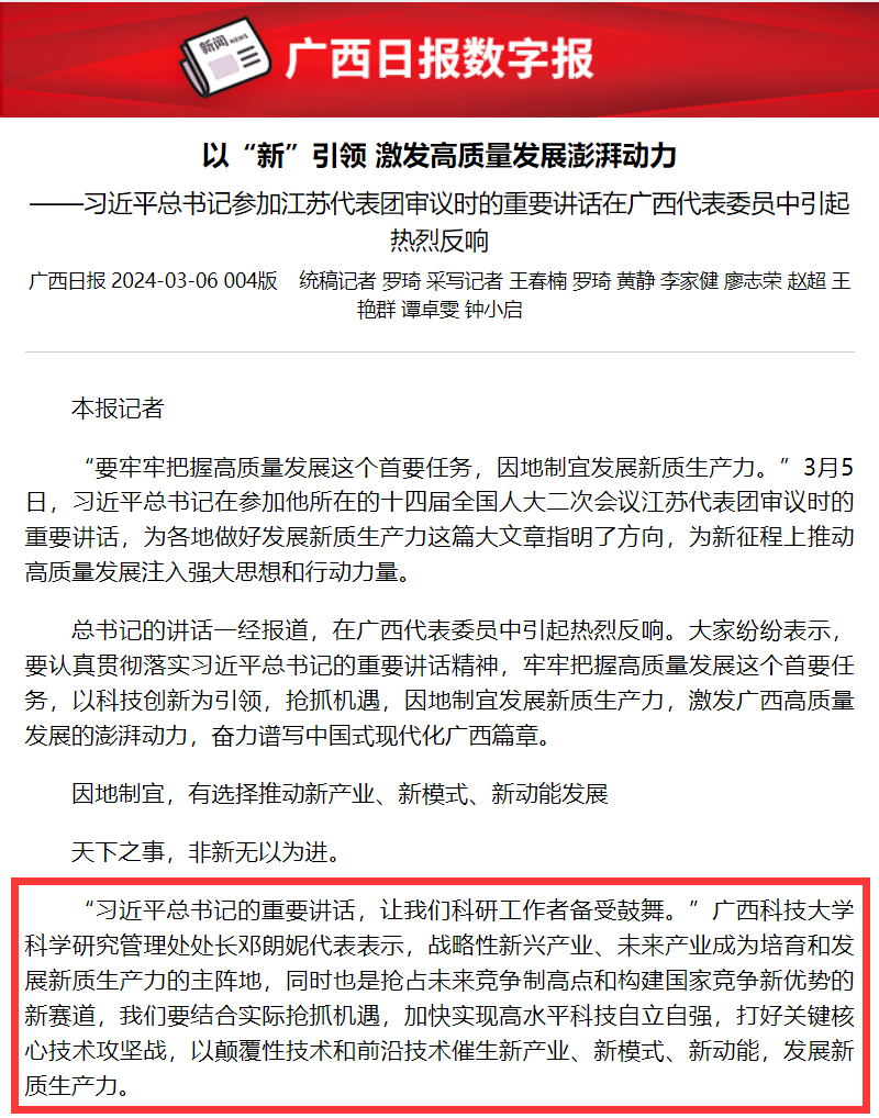“习近平总书记的重要讲话,让我们科研工作者备受鼓舞。”广西科技大学科学研究管理处处长邓朗妮代表表示,战略性新兴产业、未来产业成为培育和发展新质生产力的主阵地,同时也是抢占未来竞争制高点和构建国家竞争新优势的新赛道,我们要结合实际抢抓机遇,加快实现高水平科技自立自强,打好关键核心技术攻坚战,以颠覆性技术和前沿技术催生新产业、新模式、新动能,发展新质生产力。