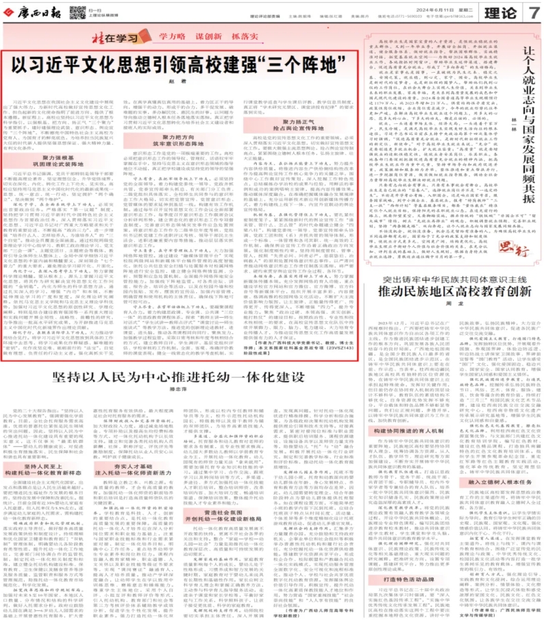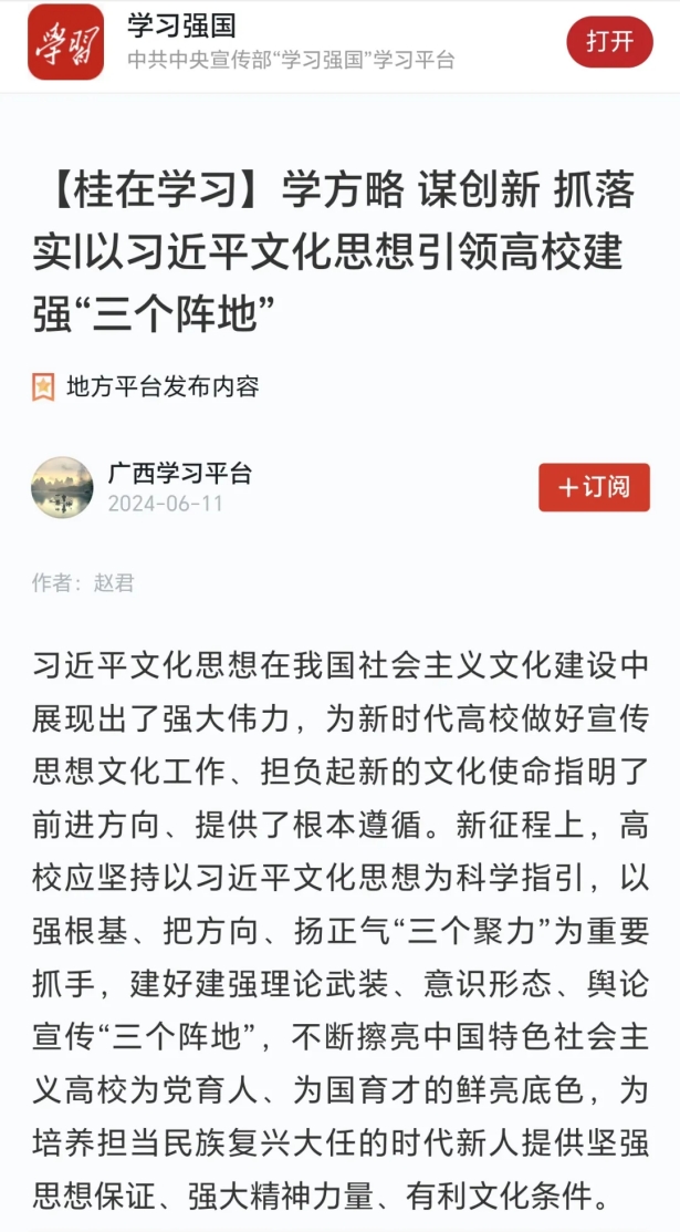 习近平文化思想是习近平新时代中国特色社会主义思想的重要组成部分,是“两个结合”的重要理论结晶。正当全校上下按照党中央和自治区党委的统一部署,深入开展党纪学习教育、巩固拓展学习贯彻习近平新时代中国特色社会主义思想主题教育成果之际,6月11日,《广西日报》理论版头条刊登了我校党委书记、博士生导师赵君教授的理论文章《以习近平文化思想引领高校建强“三个阵地”》。该文同日被“学习强国”平台全文转发。