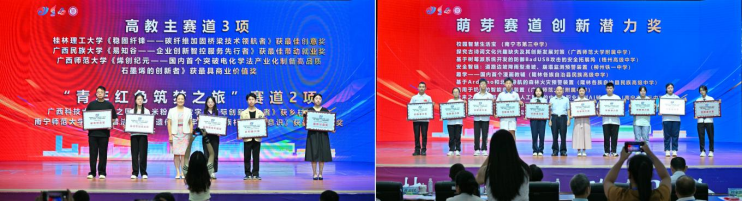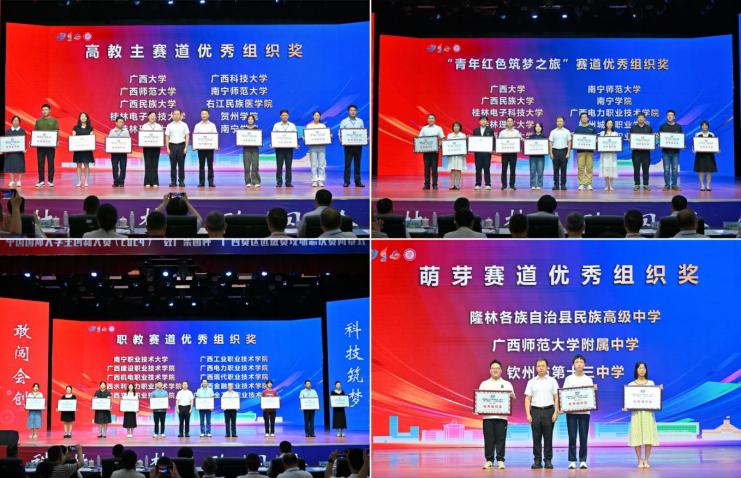 在颁奖仪式上,闫炳辰为冠军争夺赛项目、优秀组织奖获奖单位颁奖,并为承办单位、冠名单位、协办单位等颁发了感谢状;刘宝臣为高教主赛道金奖项目颁奖,柳州市人民政府副市长卢柳屏为“青年红色筑梦之旅”赛道金奖项目颁奖;共青团广西区委副书记周磊为职教赛道金奖项目颁奖;广西科学院党组成员、副院长黄志民为产业命题赛道金奖项目颁奖;广西科技大学党委常委、副校长秦小云为单项奖颁奖;自治区科学技术协会党组成员、副主席刘家凯为萌芽赛道创新潜力奖颁奖。