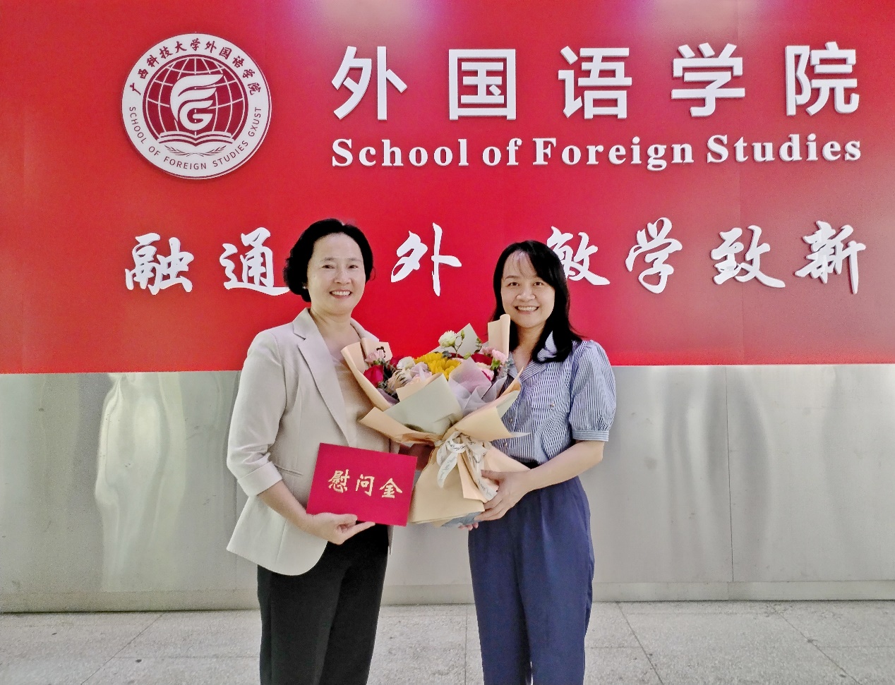 校党委常委、副校长邓朗妮(右)慰问外国语学院郑丽萍老师