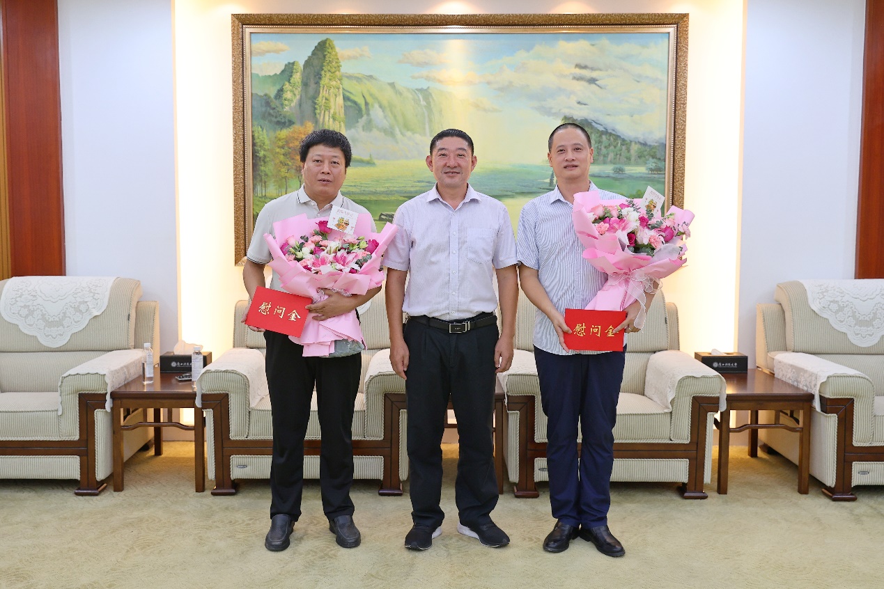 学校党委副书记、校长刘宝臣(中)慰问机械汽车学院张志清老师、自动化学院王世刚老师