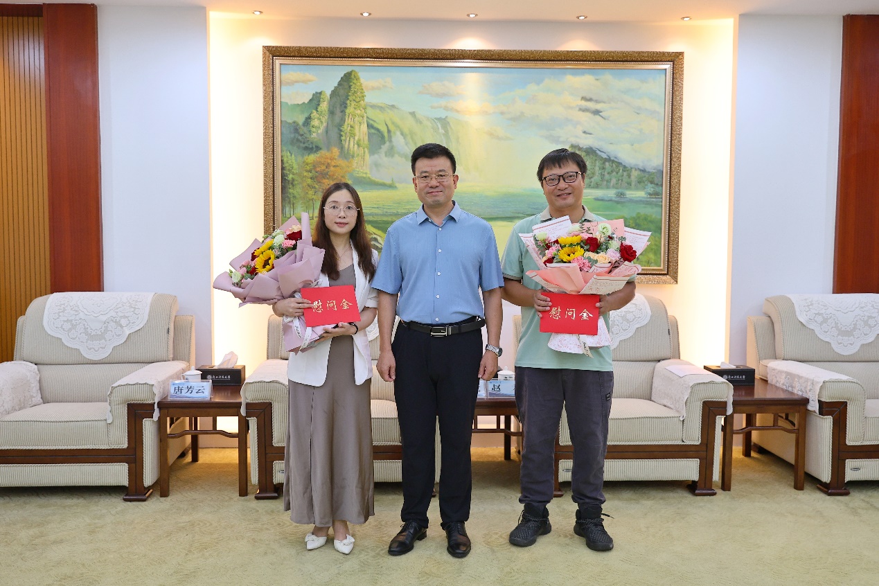 学校党委书记赵君(中)慰问生物与化学工程学院易弋老师、马克思主义学院唐芳云老师
