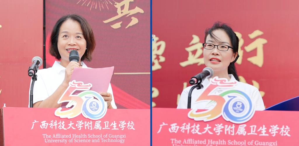 附属卫校党总支书记邓燕主持庆祝大会,党总支副书记、校长冯学珍致辞,教师代表朱巍、校友代表覃启鲜发言,学生代表严芸茜献词;校友代表还为教师代表献上鲜花,感念师恩。