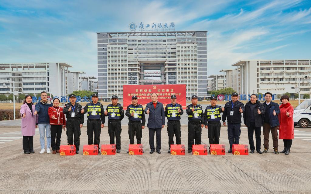 灵蛇献瑞,巳巳如意。1月29日,农历大年初一,在新春佳节万家团圆之时,学校党委常委、副校长蔡亮,学校党委常委、组织部部长麦林,学校党委常委、统战部部长、党政办主任卢志平率领学校相关职能部门负责人,深入学校文昌、柳石、柳东校区各值班岗位,看望慰问坚守一线工作岗位的安全保卫和物业服务人员,代表学校党委、行政送上新春的节日祝福。