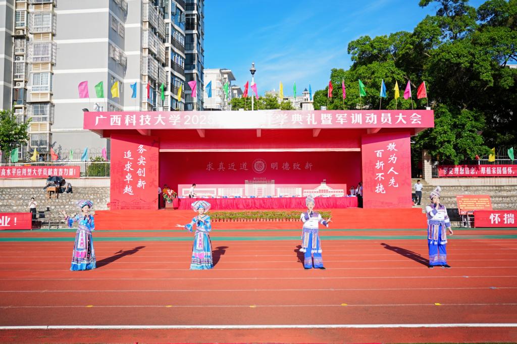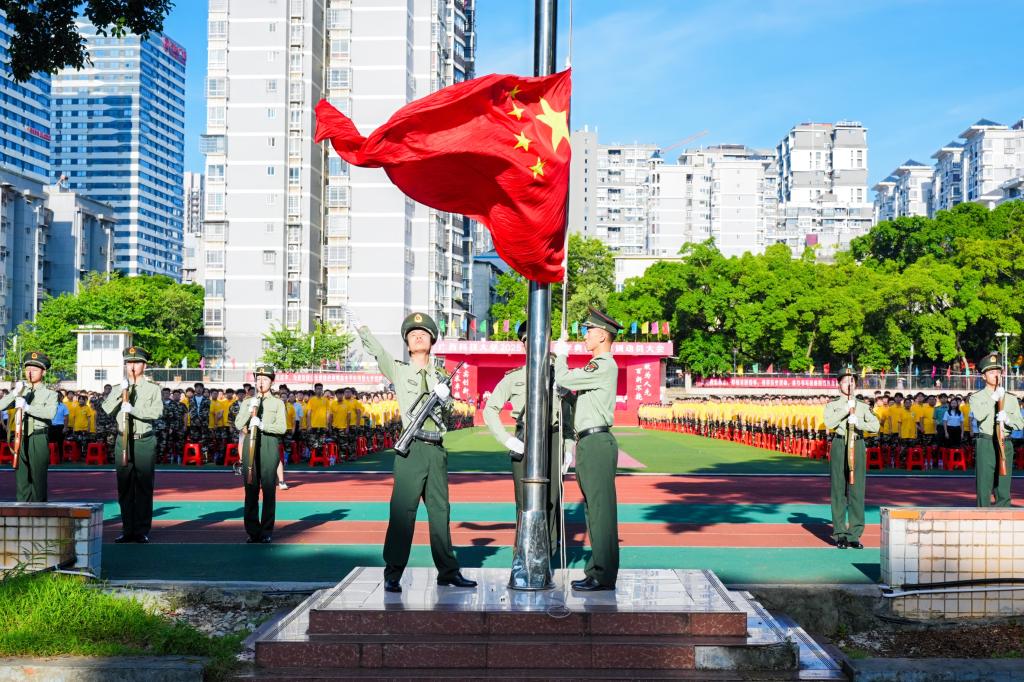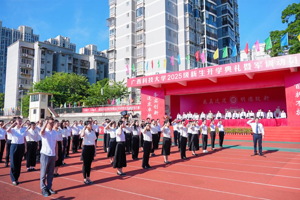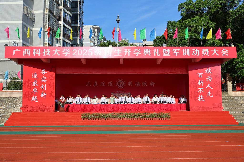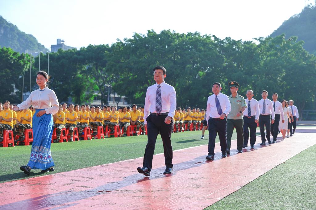 鲲鹏展翅九万里,学子逐梦启新程。8月25日上午,学校2025级新生开学典礼暨军训动员大会在文昌校区田径场隆重举行。学校党委常委赵君、刘宝臣、张发钦、宾月景、符志光、邓朗妮、张海英、蔡亮、李健、麦林、卢志平、戚杰强,武警柳州支队上校参谋长兰壮宽出席活动。学校党委常委、副校长李健主持活动。